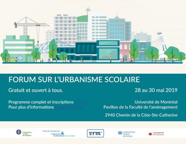 In het kader van onderzoek naar onderwijs vanuit een urbanistisch perspectief, organiseert de Universiteit van Montréal  (Faculté de l’aménagement – École d’urbanisme et d’architecture de paysage) een collaboratief Forum in samenwerking met de Commission scolaire van Montreal. Dit vindt plaats van 28 tot 30 mei 2019 in Montreal.