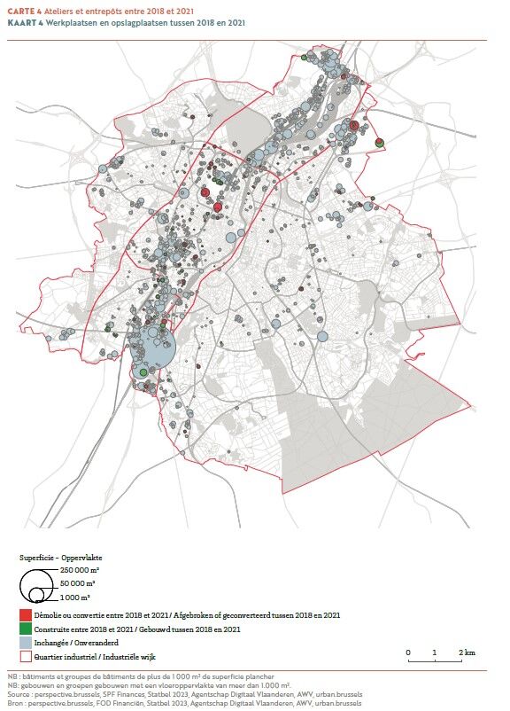 Het Gewest heeft sinds 2018 185.000 m² aan industriële ruimte verloren, een gemiddeld verlies van 46.250 m² per jaar, waarvan het grootste deel werd omgebouwd voor huisvesting of openbare voorzieningen (+167.000 m²). Vandaag beschikt het Gewest over een totaal van 4.330.000 m² industriële ruimte, tegenover 5.722.500 m² in 1997, een daling van gemiddeld 58.000 m² per jaar over deze periode.